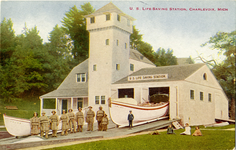 View of men posing with boat in front of the U.S. Life Saving Station in Charlevoix, Michigan. Printed on front: "U.S. Life Saving Station, Charlevoix, Mich." Printed on back: "V.O. Hammon Publishing Co., Chicago."