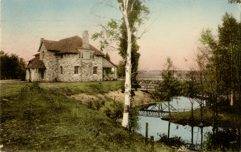 View of stone house and river at Loeb Farms in Charlevoix, Michigan. Printed on back: "Published by W.C. Bellinger. Loeb Farms, Charlevoix, Mich." Handwritten on back: "Sept. 2, 1924. Hello Jo, Just getting ready for lunch. Saw Florence Fenn & her husband a few minutes ago. Walked down to Lake Michigan & down to their town today. We said we wouldn't do it again its too far. They have pretty things to sell but very expensive. Jennie." Card is postmarked September 2, 1924.