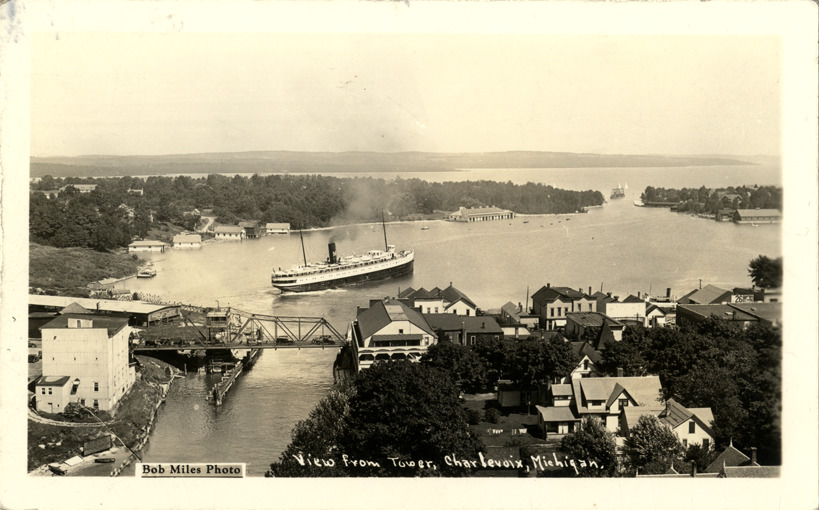Bird's-eye view of steamship in harbor traveling toward a swing bridge in Charlevoix, Michigan. Houses and commercial buildings in foreground. Printed on front: "View from tower, Charlevoix, Michigan. Bob Miles photo."