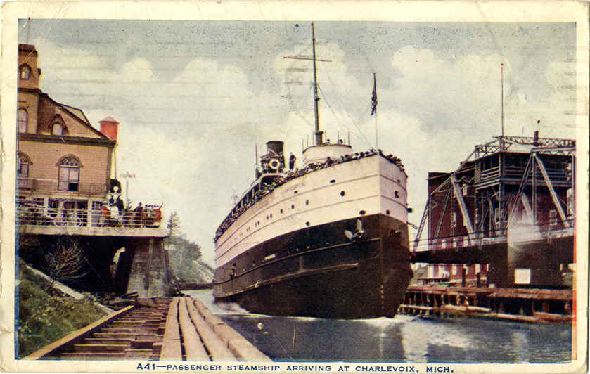 View of a passenger steamship arriving in Charlevoix, Michigan. Printed on front: "A41. Passenger steamship arriving at Charlevoix, Michigan." Printed on back: "V.O. Hammon Publishing Co., Chicago." Handwritten on back: "Hello Sis, Hows the beanery? Just down to the beach. Met a few nice fellows introduced by a nurse [undecipherable], your sister Clem." Card is postmarked August 3, 1920.
