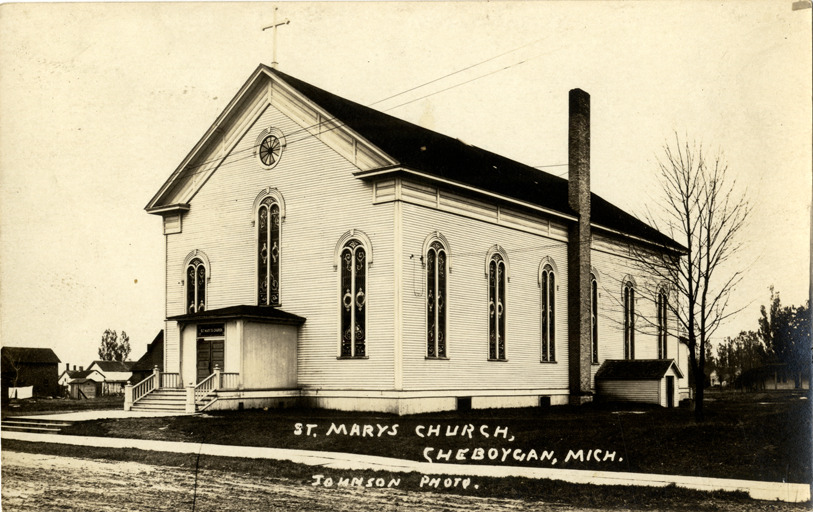 View of the St. Mary's Catholic Church in Cheboygan, Michigan. Printed on front: "St. Mary's Church, Cheboygan, Mich. Johnson, photo." Handwritten on back: "Just to let you know we got here OK and having a fine time. One puncture on the way down not so bad. Hey? Regards to your mother & all, Mr. & Mrs. Redmond." Card is postmarked October 20.