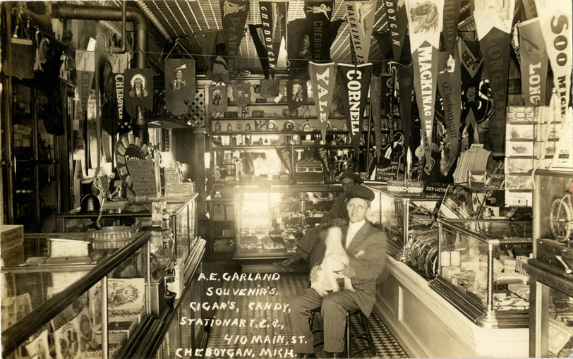 View of two men and a dog posing inside the A.E. Garland souvenir shop in Cheboygan, Michigan. Pennants are displayed from ceiling; glass cases display cigars and other merchandise. Printed on front: "A.E. Garland souvenir's. Cigar's, candy, stationary [sic], & &. 410 Main St., Cheboygan, Mich."