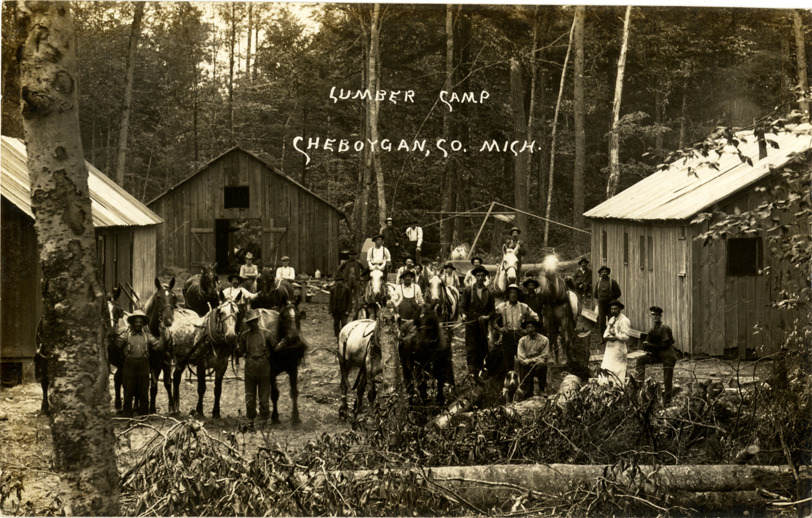 Favorite this☆ Men at lumber camp, Cheboygan, Michigan Description: View of men posing with horses at a lumber camp in Cheboygan, Michigan. Board-and-batten buildings in background. Printed on front: "Lumber camp, Cheboygan Co., Mich." Details Resource ID: bh012307 Subject: Lumber camps--Michigan--Cheboygan Loggers--Michigan--Cheboygan Wooden-frame buildings--Michigan--Cheboygan Horses--Michigan--Cheboygan Photographic prints Postcards Date Issued: Unknown year Format: 1 postcard ; 3.5 x 5.5 in. Member of: Burton Historical Collection Filing Location: M/Localities-Cheboygan Rights: Physical rights are retained by DPL. Copyright is retained in accordance with U.S. copyright laws.