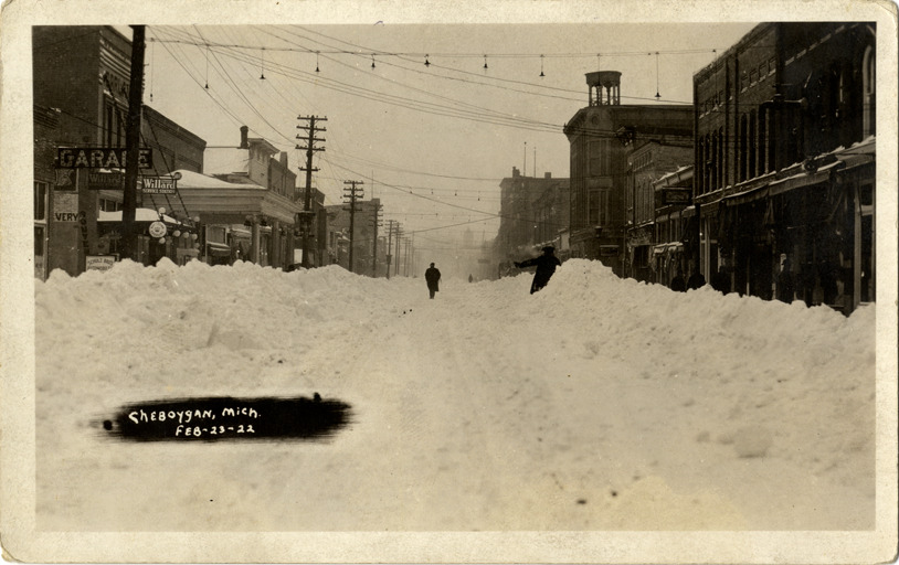 Favorite this☆ Snow-covered street, Cheboygan, Michigan Description: View of two men on a snow-covered street in Cheboygan, Michigan. Commercial buildings in background. Printed on front: "Cheboygan, Mich. Feb-23-22." Details Resource ID: bh012309 Subject: Streets--Michigan--Cheboygan Snow--Michigan--Cheboygan Winter storms--Michigan--Cheboygan Photographic prints Postcards Date Issued: 1922-02-23 Format: 1 postcard ; 3.5 x 5.5 in. Member of: Burton Historical Collection Filing Location: M/Localities-Cheboygan Rights: Physical rights are retained by DPL. Copyright is retained in accordance with U.S. copyright laws.