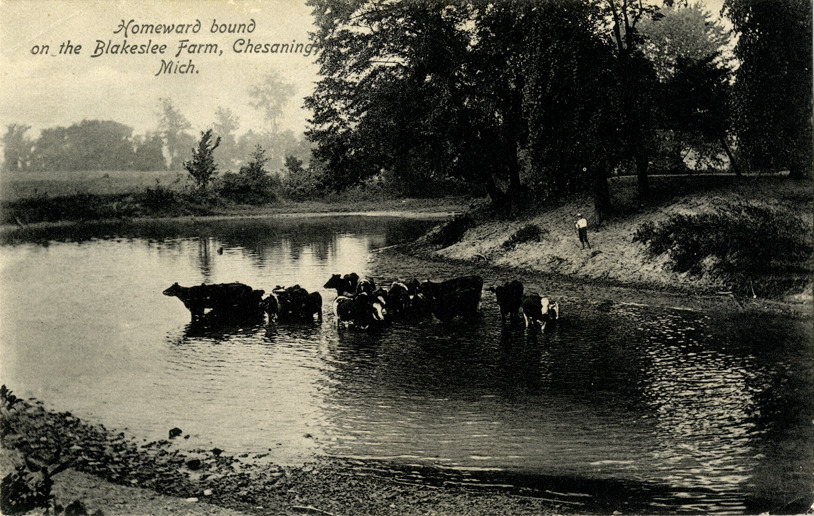 View of cows crossing a river on the Blakeslee Farm in Chesaning, Michigan. Printed on front: "Homeward bound on the Blakeslee Farm, Chesaning, Mich." Printed on back: "Pub. by Geo. B. Send, Chesaning, Mich. Made in Germany." Handwritten on back: "Aug. 25, '09. Am down here having a crazy time. Do you know what that is like? E.M.H." Card is postmarked August 25, 1909.