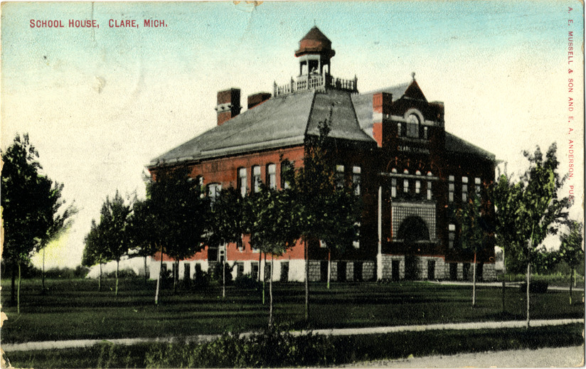 View of the schoolhouse in Clare, Michigan. Printed on front: "School house, Clare, Mich. A.E. Mussell & Son and E.A. Anderson, pub." Handwritten on back: "Dear Mama, this is the place. Have secured room and board and ... are fine places. Will write and tell you all about ... tomorrow. Is everyone at home alright? Don't worry about me for am doing nicely so far. Just take good care of yourself and Papa. With love, Bess."