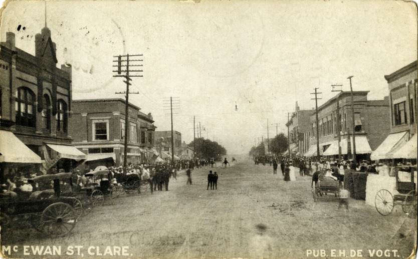 View of commercial buildings on McEwan St. in Clare, Michigan. Printed on front: "McEwan St., Clare. Pub. E.H. De Vogt." Handwritten on back: "I got the apron and I thank you I think it the sweetest apron ever was. Dear Cousin and all, How are you we are all well at present. DeVere has been awful sick but is well now he is playing now. Well good by, your cousin." Card is postmarked January 30, 1908.