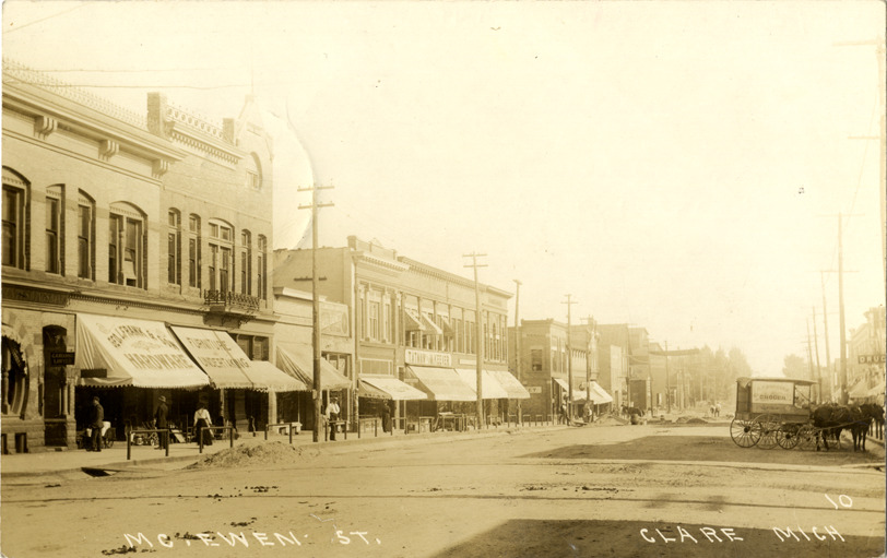 View of commercial buildings on McEwan St. in Clare, Michigan. Printed on front: "McEwen [sic] St., Clare, Mich." Handwritten on back: "All well. Going to Robs and the lake today if it doesn't rain. Will come home by the Cornwell farm. Father." Card is postmarked August 22, 1911.