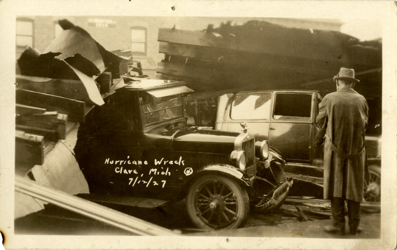 Favorite this☆ Automobiles damaged by tornado, Clare, Michigan Description: View of cars damaged by a tornado in Clare, Michigan. Debris covers cars; man stands in foreground. Printed on front: "Hurricane wreck, Clare, Mich. 7/12/27." Details Resource ID: bh012388 Subject: Tornado damage--Michigan--Clare Automobiles--Michigan--Clare Photographic prints Postcards Date Issued: 1927-07-27 Format: 1 postcard ; 3.5 x 5.5 in. Member of: Burton Historical Collection Filing Location: M/Localities-Clare Rights: Physical rights are retained by DPL. Copyright is retained in accordance with U.S. copyright laws.