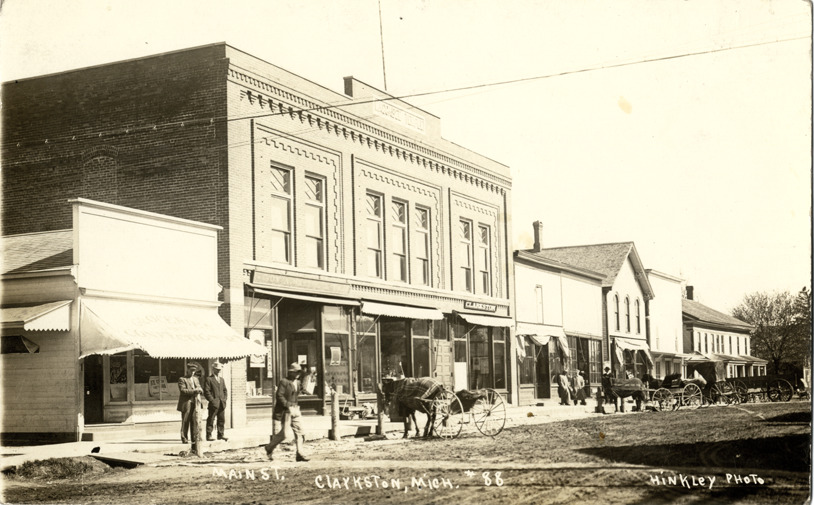 Favorite this☆ Main Street, Clarkston, Michigan Description: View of commercial buildings and horse-drawn vehicles on Main St. in Clarkston, Michigan. Printed on front: "Main St., Clarkston, Mich. #88. Hinkley, photo." Details Resource ID: bh012406 Creator: Hinkley, Royal Galusha Subject: Streets--Michigan--Clarkston Commercial buildings--Michigan--Clarkston Horse-drawn vehicles--Michigan--Clarkston Photographers--Michigan Photographic prints Postcards Date Issued: Unknown year Format: 1 postcard ; 3.5 x 5.5 in. Member of: Burton Historical Collection Filing Location: M/Localities-Clarkston Rights: Physical rights are retained by DPL. Copyright is retained in accordance with U.S. copyright laws.