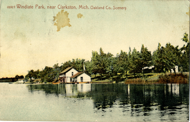 View of boathouse on lake at Windiate Park in Clarkston, Michigan. Printed on front: "01817. Windiate Park, near Clarkston, Mich. Oakland Co. scenery." Printed on back: "Published by Backenstone Book Store, Pontiac, Mich. Made in Germany." Handwritten on back: "Mrs. Graham is very sick we were just up there. She is not expected to live. Do you want to come in & bring Harry. Ralph." Card is postmarked August 13, 1910.