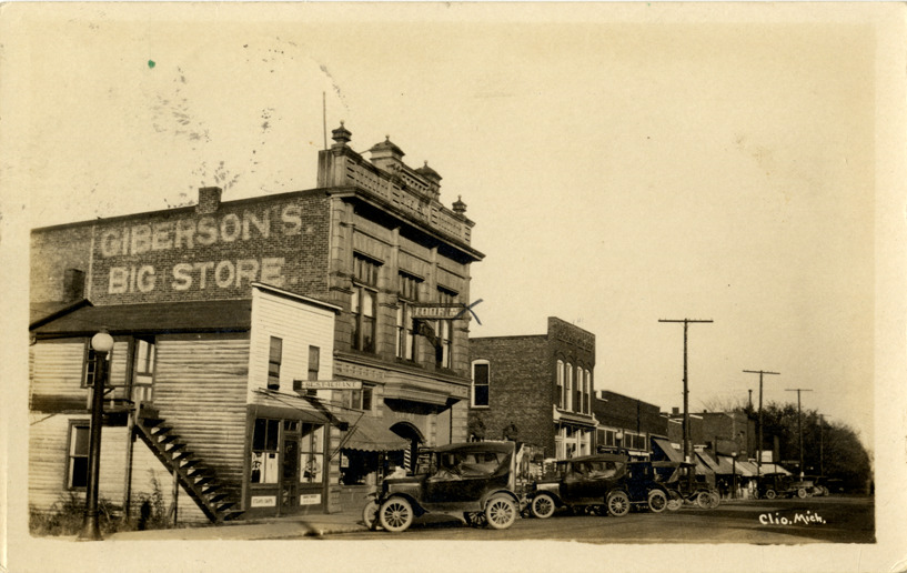 View of cars parked in front of several commercial buildings on an unidentified street in Clio, Michigan. Printed on front: "Clio, Mich." Handwritten on back: "Dear Connie, Arrived here at 7:00. Sure wish you were along. We drill here at the I.O.O.F. hall. Ellen & Cathern." Card is postmarked March 20, 1925.