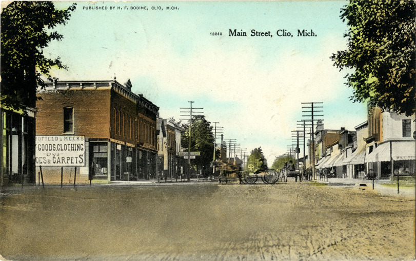 View of commercial buildings and horse-drawn wagons on Main St. in Clio, Michigan. Printed on front: "13240, Main Street, Clio, Mich. Published by H.F. Bodine, Clio, Mich." Handwritten on back: "Dear Friend, Just a line from Clio. Violet and I came for the home coming. Will go home Sunday. Will visit you next. Cannot tell now just when. Hope you are well. Lena Good." Card is postmarked August 1914.