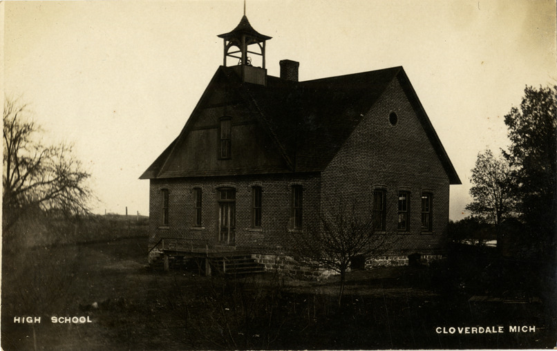 Favorite this☆ High School, Cloverdale, Michigan Description: View of the High School in Cloverdale, Michigan. Printed on front: "High School, Cloverdale, Mich." Handwritten on back: "Say, got home 5:30 Monday morn. Ha! Ha! Pretty good. H.L." Card is postmarked September 21, 1908. Details Resource ID: bh012432 Subject: High school buildings--Michigan--Cloverdale Photographic prints Postcards Date Issued: 1908 (year approximate) Format: 1 postcard ; 3.5 x 5.5 in. Member of: Burton Historical Collection Filing Location: M/Localities-Cloverdale Rights: Physical rights are retained by DPL. Copyright is retained in accordance with U.S. copyright laws.