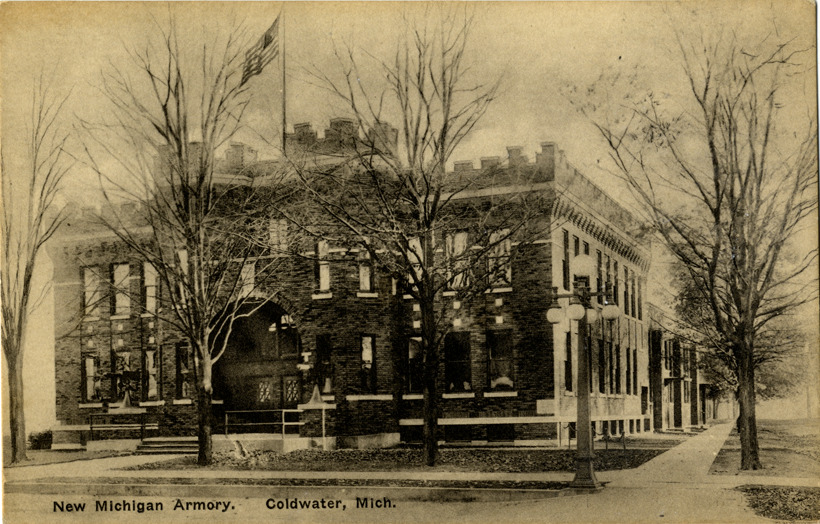 View of armory at Coldwater, Michigan. Printed on front: "New Michigan armory, Coldwater, Mich." Printed on back: "Post cards of quality, the Albertype Co., Brooklyn, N.Y." Handwritten on back: "Coldwater, 8/19-22. Dear [undecipherable], Sat. 9 a.m. I have just finished sweeping & dusting don't you think I am real smart? I attended a big celebration in Coldwater. I have had a nice time. It's terribly hot & dry here. Haven't had any rain for two weeks. Love, G.L.C." Card is postmarked August 18, 1922.
