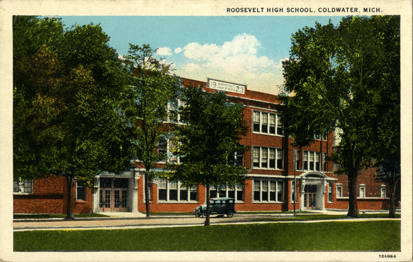 Favorite this☆ Roosevelt High School, Coldwater, Michigan Description: View of an automobile parked in front of Roosevelt High School in Coldwater, Michigan. Printed on front: "Roosevelt High School, Coldwater, Mich." Printed on back: "Published by N.E. Roby's Drug Store, Coldwater, Mich. C.T. American Art Colored." Details Resource ID: bh012442 Subject: High school buildings--Michigan--Coldwater Postcards Publisher: N.E. Roby's Drug Store Curt Teich & Co. Date Issued: Unknown year Format: 1 postcard : col. ; 3.5 x 5.5 in. Member of: Burton Historical Collection Filing Location: M/Localities-Coldwater Rights: Physical rights are retained by DPL. Copyright is retained in accordance with U.S. copyright laws.