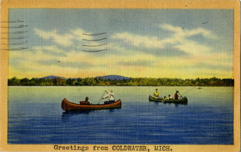 View of the canoeists on lake in Coldwater, Michigan. Printed on front: "Greetings from Coldwater, Michigan." Printed on back: "Tichnor quality views, reg. U.S. Pat. Off. Made only by Tichnor Bros, Inc., Boston, Mass." Handwritten on back: "Dear Kathryn, I am just wondering if you have staid [sic] put or will you be gone by the time I get back. We are certainly enjoying our stay here, again nothing to do but eat, sleep and enjoy ourselves. Love, Eva A.S." Card is postmarked August 17, 1945.