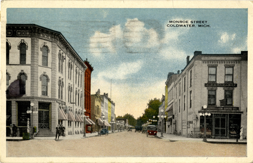 View of commercial buildings on Monroe St. in Coldwater, Michigan. Printed on front: "Monroe Street, Coldwater, Mich." Handwritten on back: "Coldwater, Mich. 8/31/20. Dear [undecipherable], Well how does it seem to be back in the [undecipherable] again? I am sure having a good time and dread to think of going back to work. Katherine." Card is postmarked August 31, 1920.