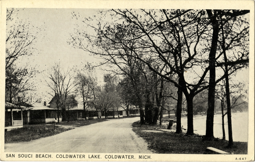 View of houses on San Souci Beach at Coldwater Lake in Coldwater, Michigan. Printed on front: "San Souci Beach, Coldwater Lake, Coldwater, Mich." Printed on back: "Mfd. by Fort Wayne Printing Co., Fort Wayne, Ind."
