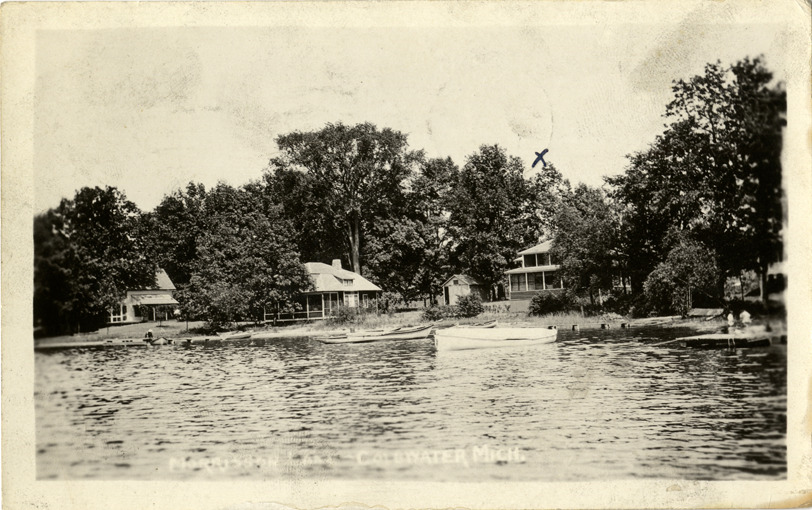 View of houses along the shore of Morrison Lake in Coldwater, Michigan. Boats are docked at shore. Handwritten "X" above house on right. Printed on front: "Morrison Lake, Coldwater, Mich." Handwritten on back: "The cottage under the x is Miss Starr's where we are. Had a glorious ride out yesterday. Will be home probably Friday. Wish you were here. Raining some today so I can't play golf. B.H.M." Card is postmarked July 3, 1923.