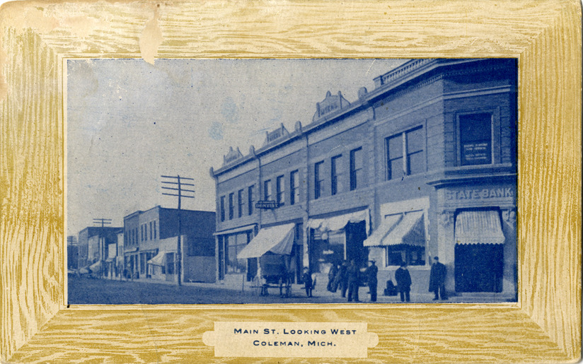 View of commercial buildings on Main Street in Coleman, Michigan. Printed on front: "Main St., looking west, Coleman, Mich." Printed on back: "Published by the Wayne Supply Co., Toledo, Ohio." Handwritten on back: "Coleman, Mich. 8-1-10. Dear Friend, We are in the great cool Mich. Having a nice time. Been here since last Wed. Expect to get home next Sunday from your friend Pearl." Card is postmarked August 1, 1910.