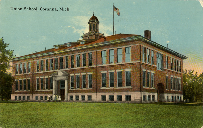 View of the Union School in Corunna, Michigan. Printed on front: "Union School, Corunna, Mich." Handwritten on back: "I will drop you just a line to let you know that Mrs. Smith is slowly on the mend. I am hoping to bring her home in a couple of weeks. Sincerely yours, E.G. Smith." Card is postmarked September 18.