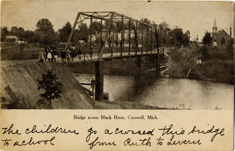 View of children posing near a truss bridge over the Black River in Croswell, Michigan. Printed on front: "Bridge across Black River, Croswell, Mich." Handwritten on front: "The children go acrossed [sic] this bridge to school from Ruth to Levern." Printed on back: "Riverside Printing Co., Port Huron, Mich." Card is postmarked July 20, 1908.
