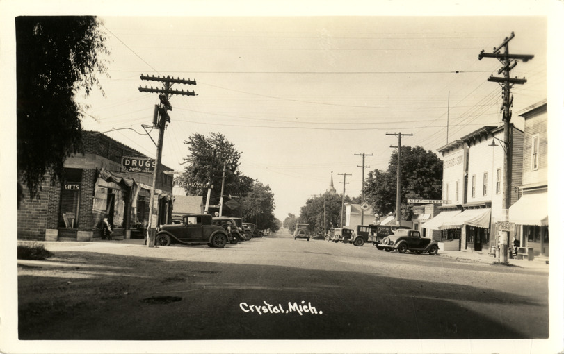 Favorite this☆ Main Street, Crystal, Michigan Description: View of cars parked in front of commercial buildings on Main St. in Crystal, Michigan. Printed on front: "Crystal, Mich." Details Resource ID: bh012525 Subject: Streets--Michigan--Crystal Commercial buildings--Michigan--Crystal Automobiles--Michigan--Crystal Photographic prints Postcards Date Issued: Unknown year Format: 1 postcard ; 3.5 x 5.5 in. Member of: Burton Historical Collection Filing Location: M/Localities-Crystal Rights: Physical rights are retained by DPL. Copyright is retained in accordance with U.S. copyright laws.