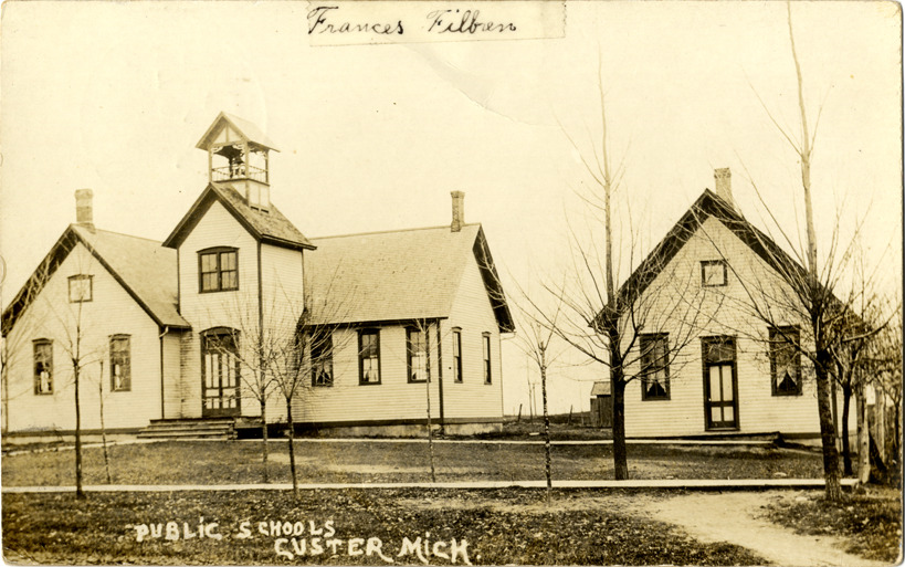 View of wooden-frame public school buildings in Custer, Michigan. Printed on front: "Public schools, Custer, Mich." Handwritten on front: "Frances Filbren." Handwritten on back: "5-16-1912. Custer, Mich. Dear Mary, We are all well. It is rainy weather up here. I've got 25 little chicks. Hain't that a lot ha? I don't dare write much for the mail is coming. I have been cleaning house hain't done yet. Sincerely, Frances F." Card is postmarked May 16, 1912.