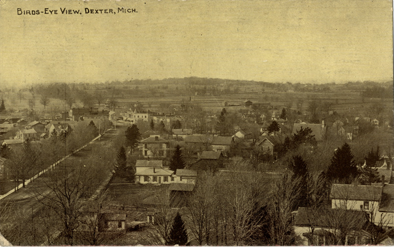 Bird's-eye view of houses and buildings in Dexter, Michigan. Printed on front: "Birds-eye view, Dexter, Mich." Printed on back: "Pub. by E.H. Carpenter, Dexter, Mich. K 197."