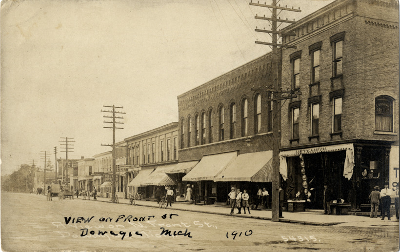 Favorite this☆ Front Street, Dowagiac, Michigan Description: View of commercial buildings on Front St. in Dowagiac, Michigan. Printed on front: "A view on N. Front St., Dowagiac, Mich., 1910." Printed on back: "C.R. Childs photograph post cards, Chicago." Details Resource ID: bh012587 Creator: Childs, Charles R. Subject: Streets--Michigan--Dowagiac Commercial buildings--Michigan--Dowagiac Photographers--Illinois--Chicago Photographic prints Postcards Date Issued: 1910 (year approximate) Format: 1 postcard ; 3.5 x 5.5 in. Member of: Burton Historical Collection Filing Location: M/Localities-Dowagiac Rights: Physical rights are retained by DPL. Copyright is retained in accordance with U.S. copyright laws.