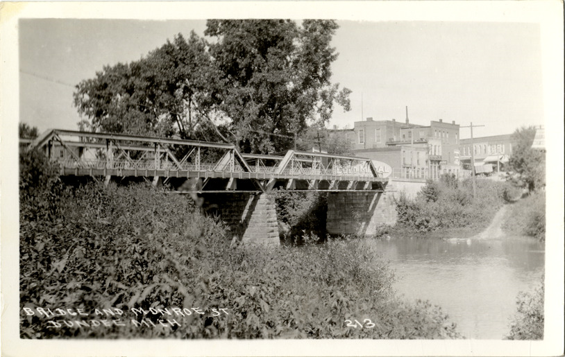 Favorite this☆ Bridge, Dundee, Michigan Description: View of truss bridge over River Raisin in Dundee, Michigan. Commercial buildings on Monroe Street in background. Printed on front: "Bridge and Monroe St., Dundee, Mich." Details Resource ID: bh012593 Subject: Truss bridges--Michigan--Dundee Commercial buildings--Michigan--Dundee Raisin River (Mich.) Photographic prints Postcards Date Issued: Unknown year Format: 1 postcard ; 3.5 x 5.5 in. Member of: Burton Historical Collection Filing Location: M/Localities-Dundee Rights: Physical rights are retained by DPL. Copyright is retained in accordance with U.S. copyright laws.