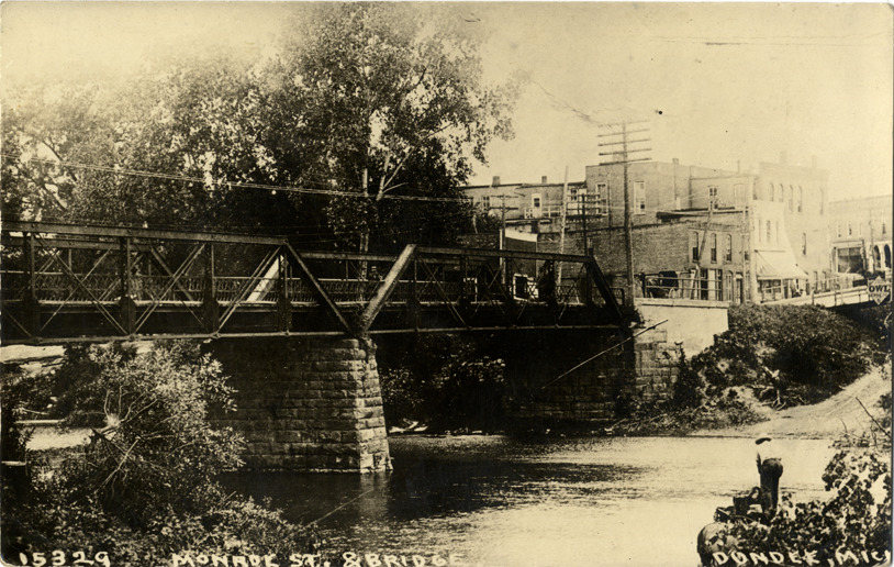 View of truss bridge over River Raisin in Dundee, Michigan. Commercial buildings on Monroe Street in background. Printed on front: "15329. Monroe St. & bridge, Dundee, Mich." Handwritten on back: "Dear Mother, I am haveing [sic] a nice time. I hope you are. I wish you were on the car with me. I saw 5 ponies, they were so cute. Good by from Lucy."