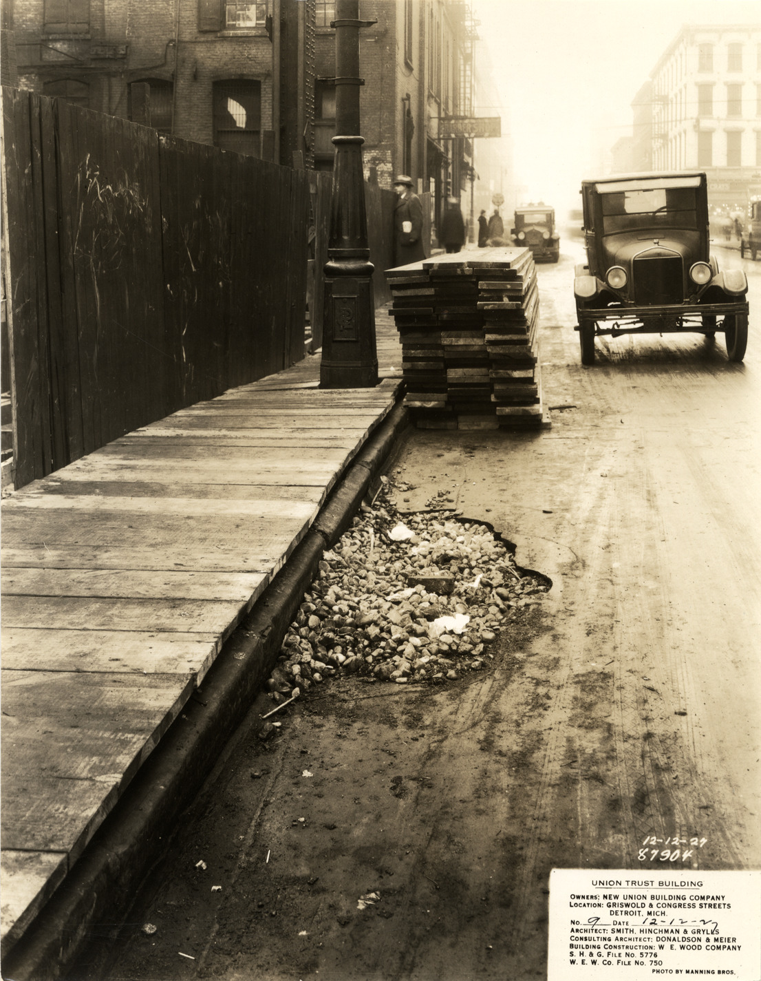Close-up view of crumbling section of pavement on the construction site of the Union Guardian Building. Stack of lumber and a car in background. The building was also known as the Guardian Building and the Union Trust Building. Printed on front: "Union Trust Building. Owners: New Union Building Company. Location: Griswold & Congress Streets, Detroit, Mich. No. 9. Date: 12-12-27. Architect: Smith, Hinchman & Grylls. Consulting architect: Donaldson & Meier. Building construction: W.E. Wood Company. S.H. & G. file no. 5776. W.E.W. Co. file no. 750. Photo by Manning Bros. 12-12-27, 87904."