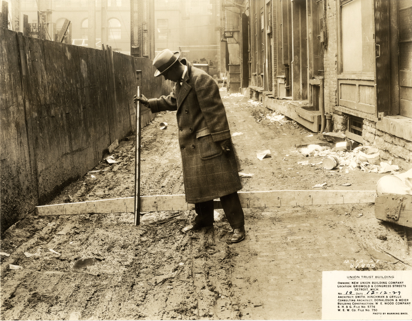 View of a man checking measurements in muddy alley with two large rulers on the construction site of the Union Guardian Building. The building was also known as the Guardian Building and the Union Trust Building. Printed on front: "Union Trust Building. Owners: New Union Building Company. Location: Griswold & Congress Streets, Detroit, Mich. No. 10. Date: 12-12-27. Architect: Smith, Hinchman & Grylls. Consulting architect: Donaldson & Meier. Building construction: W.E. Wood Company. S.H. & G. file no. 5776. W.E.W. Co. file no. 750. Photo by Manning Bros. 12-12-27, 87905."