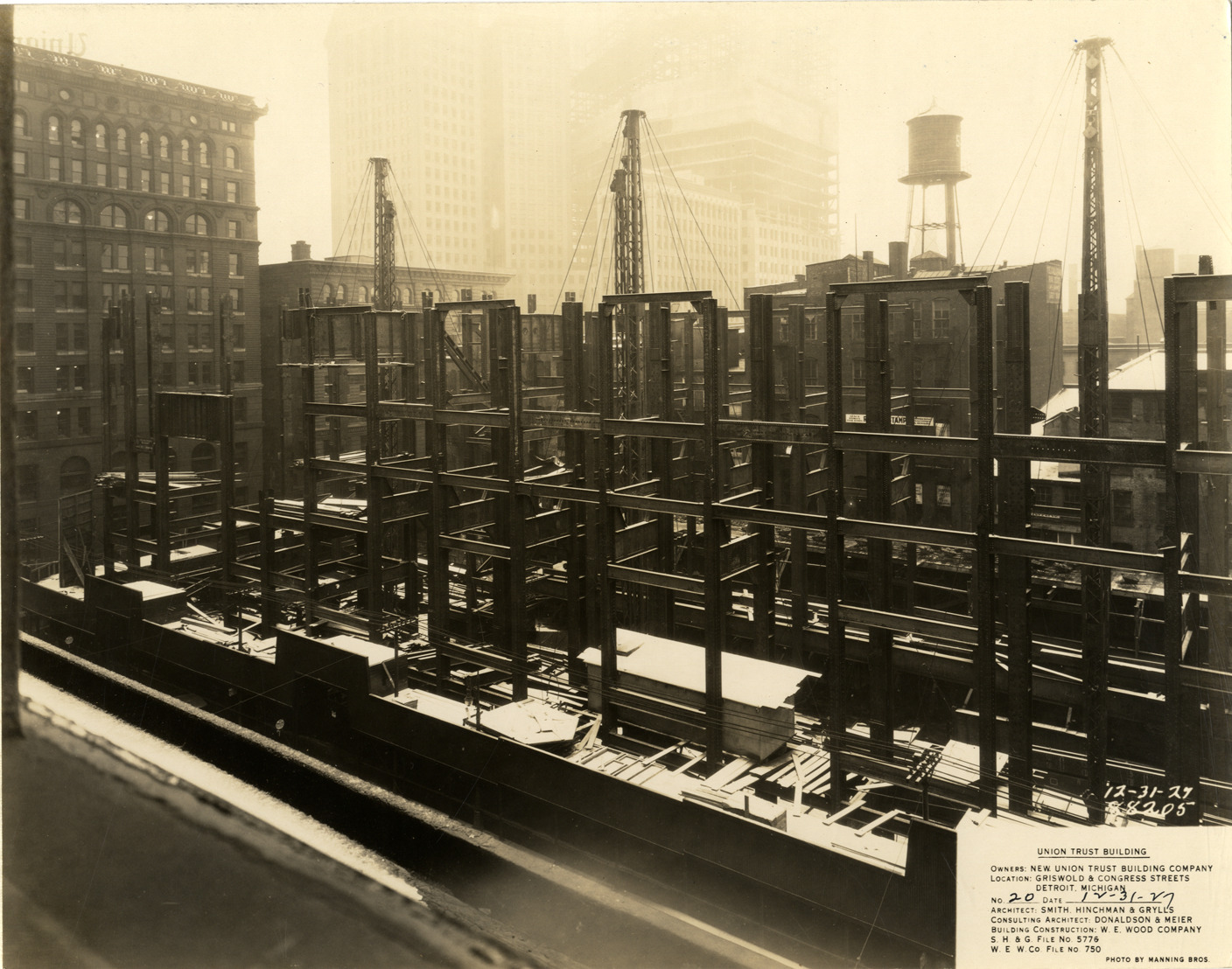 View of beams and structural framework of Union Guardian Building during construction. Crane in foreground; office and commercial buildings in background. The building was also known as the Guardian Building and the Union Trust Building. Printed on front: "Union Trust Building. Owners: New Union Building Company. Location: Griswold & Congress Streets, Detroit, Mich. No. 20. Date: 12-31-27. Architect: Smith, Hinchman & Grylls. Consulting architect: Donaldson & Meier. Building construction: W.E. Wood Company. S.H. & G. file no. 5776. W.E.W. Co. file no. 750. Photo by Manning Bros. 12-31-27, 88205."