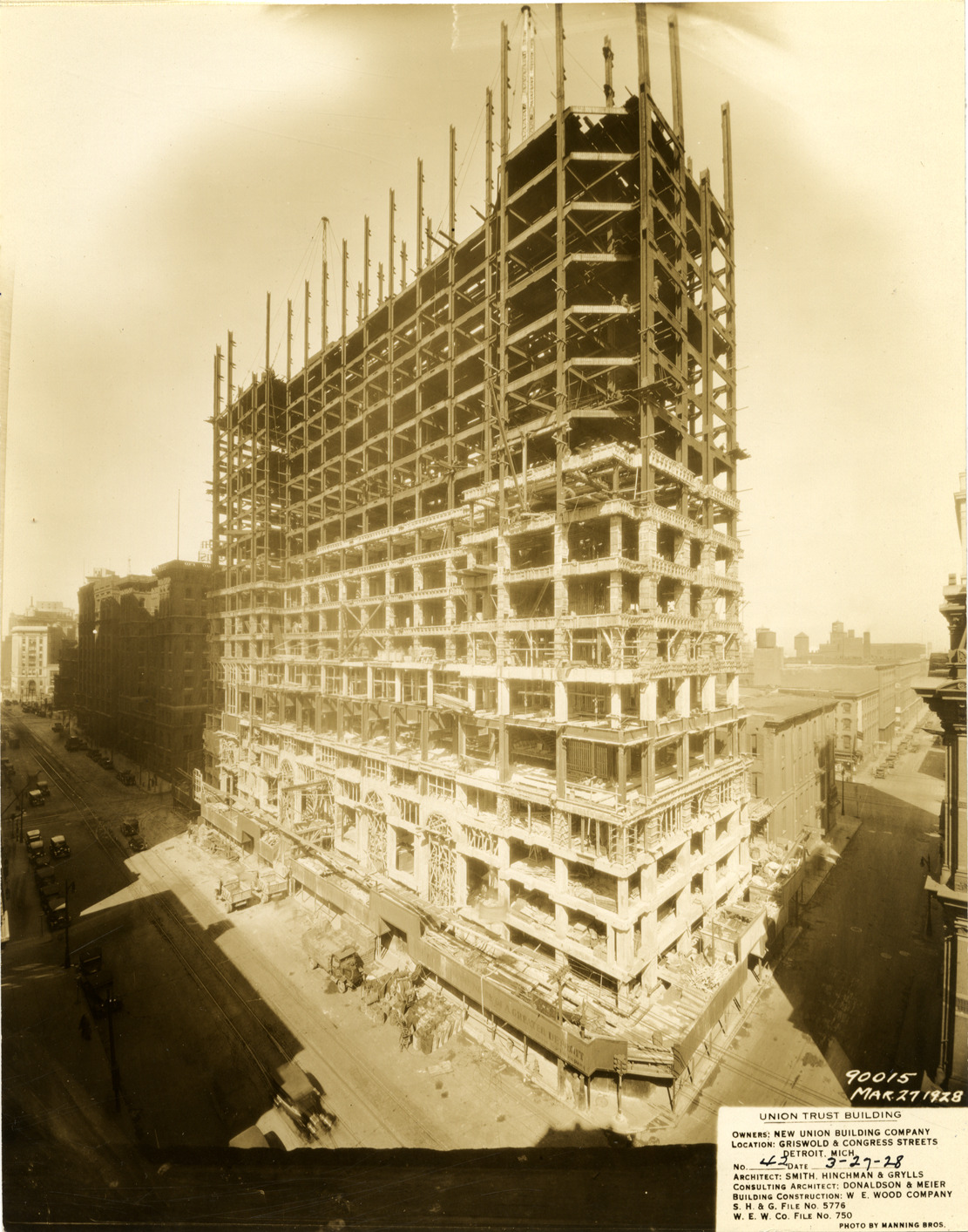 View of the Union Guardian Building during construction, showing structural framework. The building was also known as the Guardian Building and the Union Trust Building. Printed on front: "Union Trust Building. Owners: New Union Building Company. Location: Griswold & Congress Streets, Detroit, Mich. No. 42. Date: 3-27-28. Architect: Smith, Hinchman & Grylls. Consulting architect: Donaldson & Meier. Building construction: W.E. Wood Company. S.H. & G. file no. 5776. W.E.W. Co. file no. 750. Photo by Manning Bros. Mar. 27-1928, 90015."