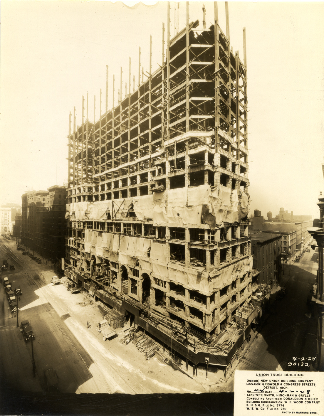 View of the Union Guardian Building during construction, showing structural framework. The building was also known as the Guardian Building and the Union Trust Building. Printed on front: "Union Trust Building. Owners: New Union Building Company. Location: Griswold & Congress Streets, Detroit, Mich. No. 44. Date: 4-2-28. Architect: Smith, Hinchman & Grylls. Consulting architect: Donaldson & Meier. Building construction: W.E. Wood Company. S.H. & G. file no. 5776. W.E.W. Co. file no. 750. Photo by Manning Bros. 4-2-28, 90132."