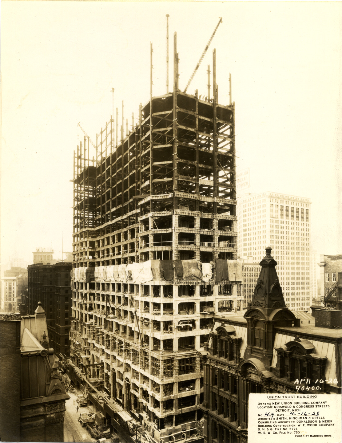 View of the Union Guardian Building during construction, showing structural framework. The building was also known as the Guardian Building and the Union Trust Building. Printed on front: "Union Trust Building. Owners: New Union Building Company. Location: Griswold & Congress Streets, Detroit, Mich. No. 49. Date: 4-16-28. Architect: Smith, Hinchman & Grylls. Consulting architect: Donaldson & Meier. Building construction: W.E. Wood Company. S.H. & G. file no. 5776. W.E.W. Co. file no. 750. Photo by Manning Bros. Apr-16-28, 90400." Stamped on back: "Manning Bros., commercial photographers, 504-505 Lincoln Building, corner State and Park Sts., Detroit, Mich."