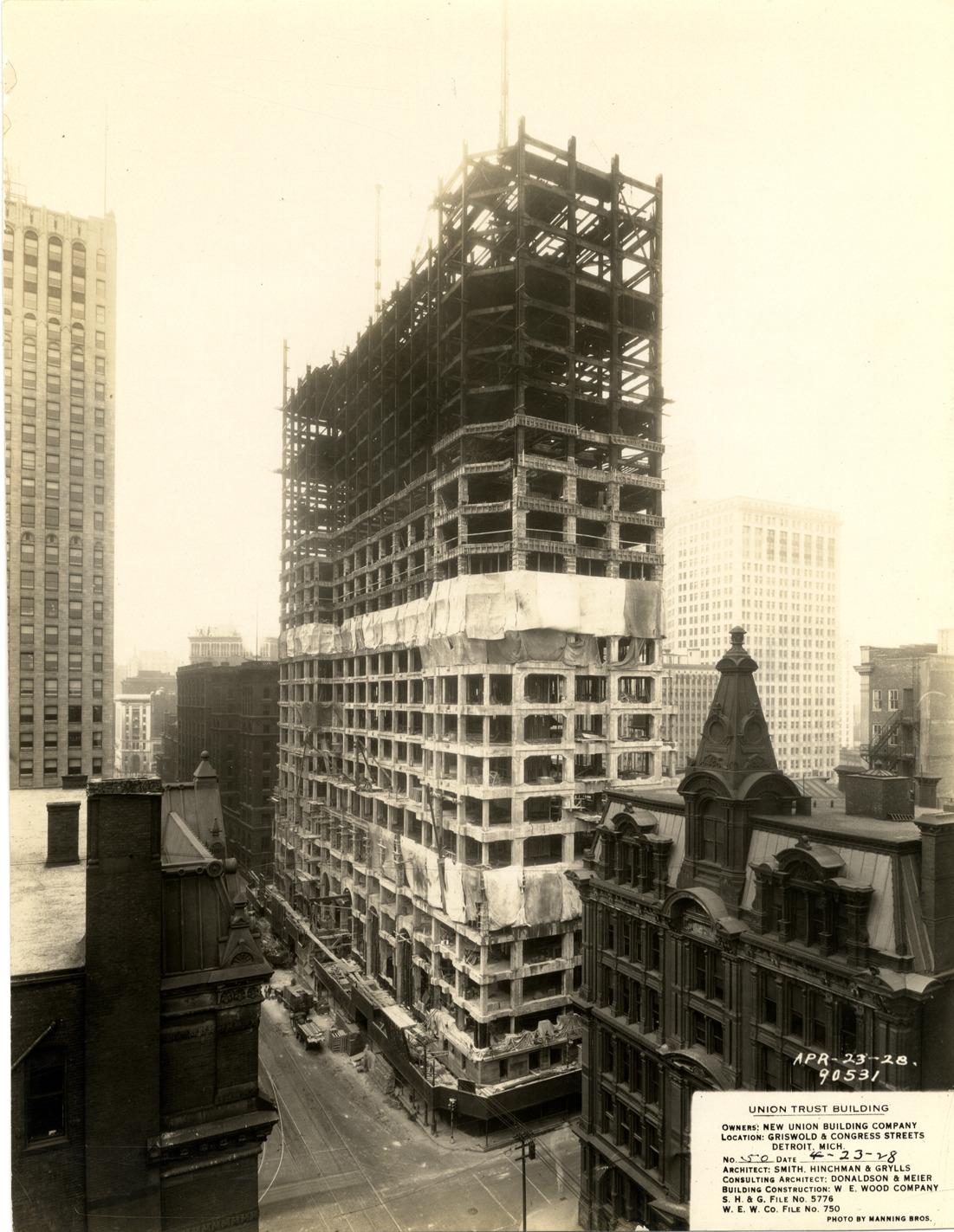 View of the Union Guardian Building during construction, showing structural framework. The building was also known as the Guardian Building and the Union Trust Building. Printed on front: "Union Trust Building. Owners: New Union Building Company. Location: Griswold & Congress Streets, Detroit, Mich. No. 50. Date: 4-23-28. Architect: Smith, Hinchman & Grylls. Consulting architect: Donaldson & Meier. Building construction: W.E. Wood Company. S.H. & G. file no. 5776. W.E.W. Co. file no. 750. Photo by Manning Bros. Apr-23-28, 90531."