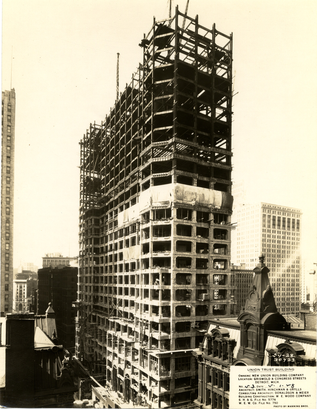 View of the Union Guardian Building during construction, showing structural framework. The building was also known as the Guardian Building and the Union Trust Building. Printed on front: "Union Trust Building. Owners: New Union Building Company. Location: Griswold & Congress Streets, Detroit, Mich. No. 53. Date: 5-1-28. Architect: Smith, Hinchman & Grylls. Consulting architect: Donaldson & Meier. Building construction: W.E. Wood Company. S.H. & G. file no. 5776. W.E.W. Co. file no. 750. Photo by Manning Bros. 5-1-28, 90723."