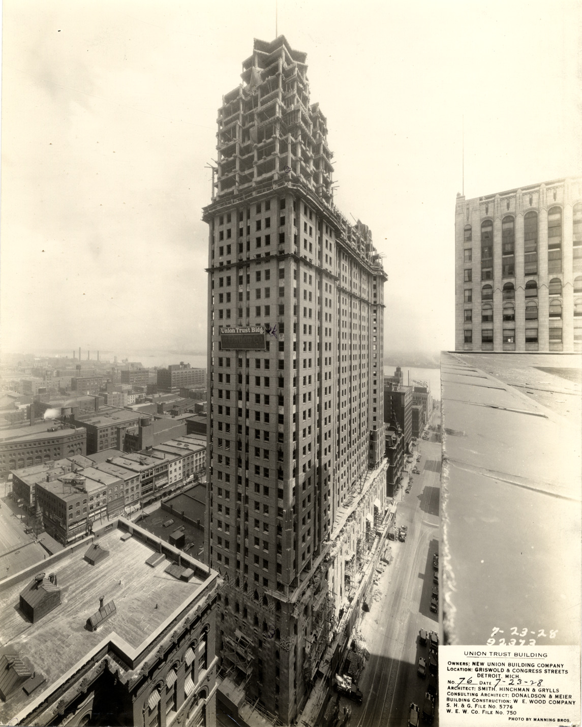 View of the Union Guardian Building during construction. "Union Trust Bldg." sign on façade. The building was also known as the Guardian Building and the Union Trust Building. Printed on front: "Union Trust Building. Owners: New Union Building Company. Location: Griswold & Congress Streets, Detroit, Mich. No. 76. Date: 7-23-28. Architect: Smith, Hinchman & Grylls. Consulting architect: Donaldson & Meier. Building construction: W.E. Wood Company. S.H. & G. file no. 5776. W.E.W. Co. file no. 750. Photo by Manning Bros. 7-23-28, 92373."