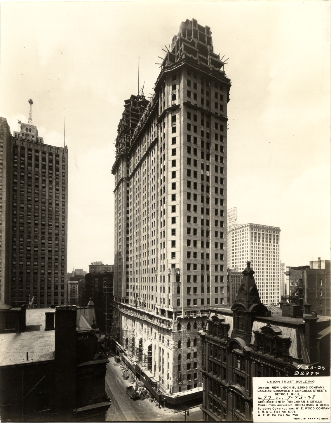 View of the Union Guardian Building during construction. The building was also known as the Guardian Building and the Union Trust Building. Printed on front: "Union Trust Building. Owners: New Union Building Company. Location: Griswold & Congress Streets, Detroit, Mich. No. 77. Date: 7-23-28. Architect: Smith, Hinchman & Grylls. Consulting architect: Donaldson & Meier. Building construction: W.E. Wood Company. S.H. & G. file no. 5776. W.E.W. Co. file no. 750. Photo by Manning Bros. 7-23-28, 92374."