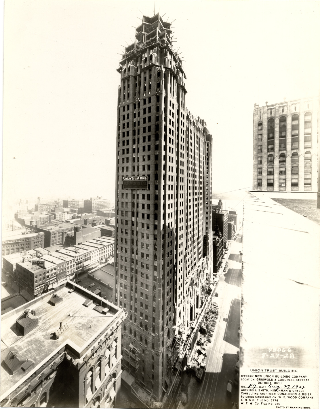 View of the Union Guardian Building during construction. "Union Trust Bldg." sign on facade. The building was also known as the Guardian Building and the Union Trust Building. Printed on front: "Union Trust Building. Owners: New Union Building Company. Location: Griswold & Congress Streets, Detroit, Mich. No. 87. Date: Aug. 27, 1928. Architect: Smith, Hinchman & Grylls. Consulting architect: Donaldson & Meier. Building construction: W.E. Wood Company. S.H. & G. file no. 5776. W.E.W. Co. file no. 750. Photo by Manning Bros. 8-27-28, 93066."