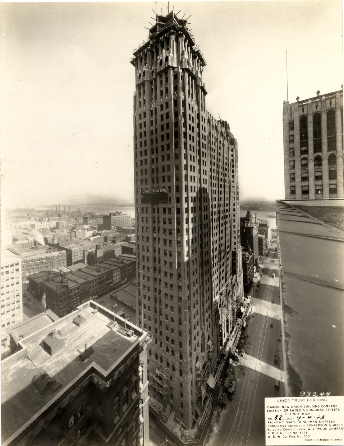 View of the Union Guardian Building during construction. "Union Trust Bldg." sign on facade. The building was also known as the Guardian Building and the Union Trust Building. Printed on front: "Union Trust Building. Owners: New Union Building Company. Location: Griswold & Congress Streets, Detroit, Mich. No. 88. Date: 9-4-28. Architect: Smith, Hinchman & Grylls. Consulting architect: Donaldson & Meier. Building construction: W.E. Wood Company. S.H. & G. file no. 5776. W.E.W. Co. file no. 750. Photo by Manning Bros. 9-4-28, 93244."