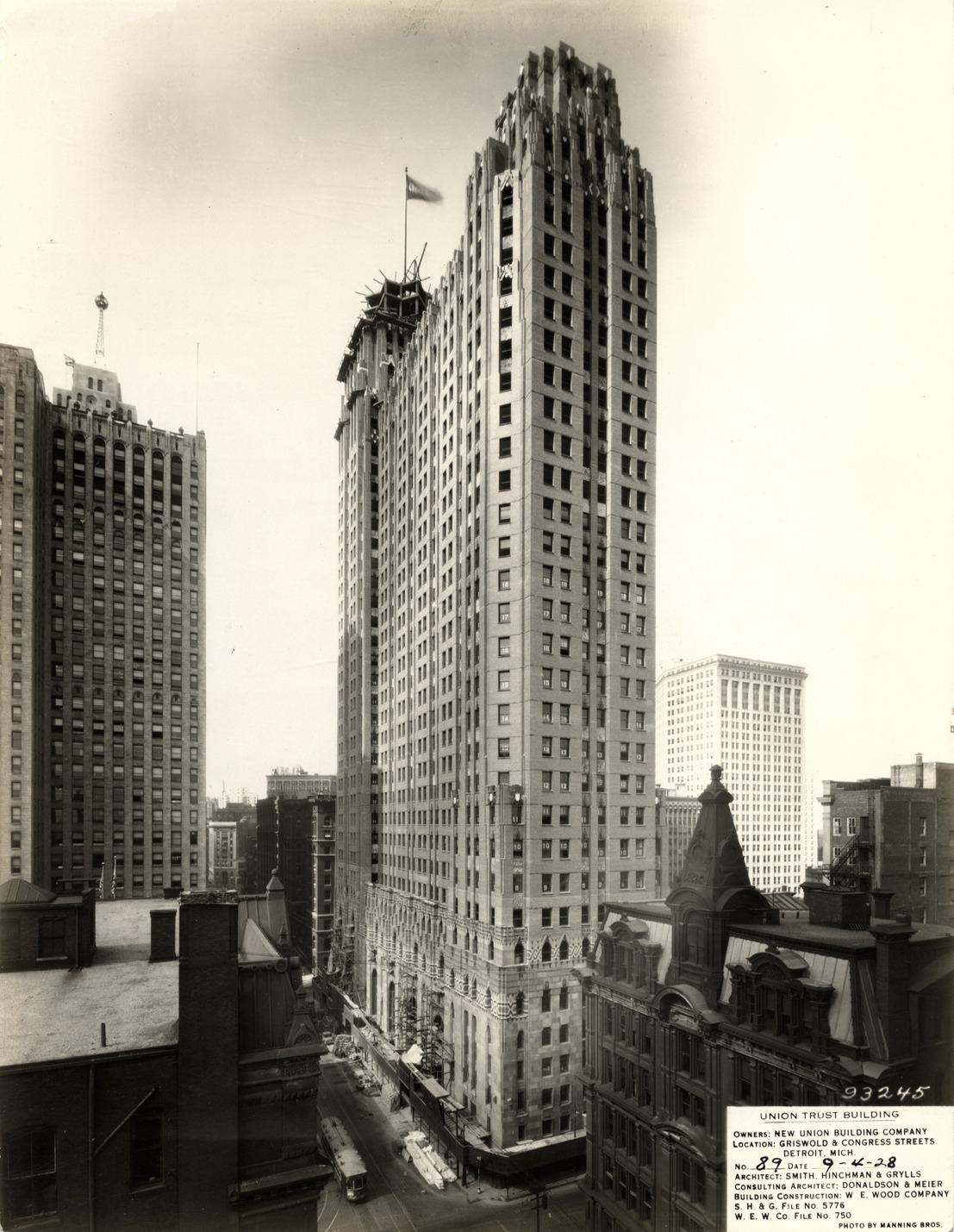 View of the Union Guardian Building during construction. The building was also known as the Guardian Building and the Union Trust Building. Printed on front: "Union Trust Building. Owners: New Union Building Company. Location: Griswold & Congress Streets, Detroit, Mich. No. 89. Date: 9-4-28. Architect: Smith, Hinchman & Grylls. Consulting architect: Donaldson & Meier. Building construction: W.E. Wood Company. S.H. & G. file no. 5776. W.E.W. Co. file no. 750. Photo by Manning Bros. 9-4-28, 93245."