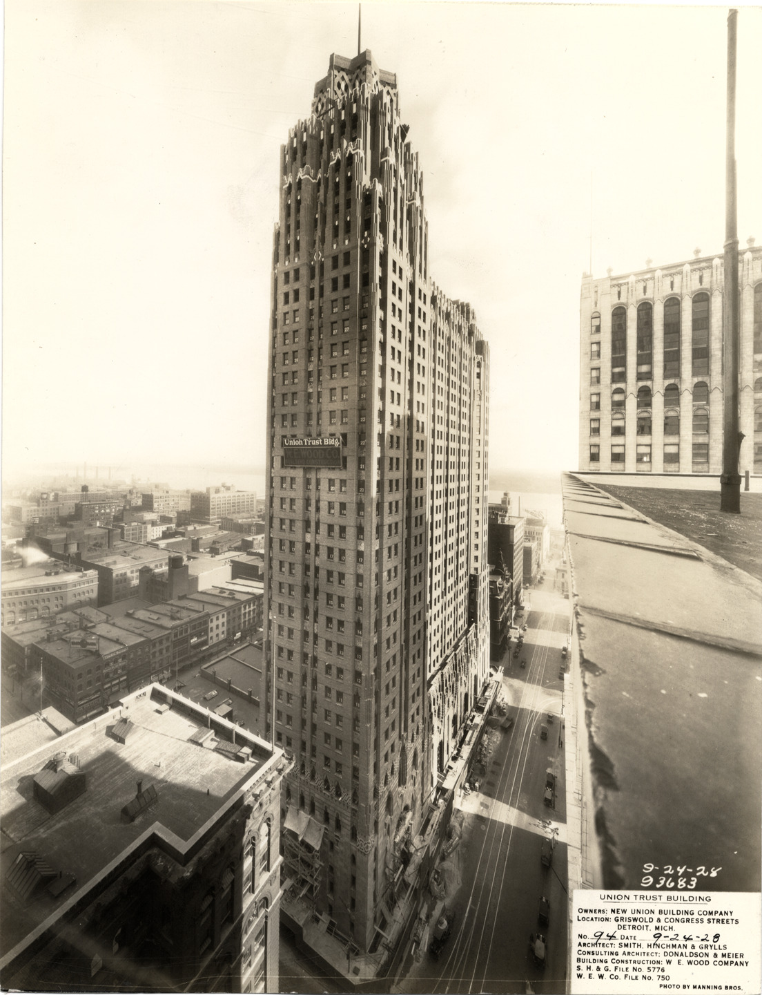 View of the Union Guardian Building during construction. "Union Trust Bldg." sign on façade. The building was also known as the Guardian Building and the Union Trust Building. Printed on front: "Union Trust Building. Owners: New Union Building Company. Location: Griswold & Congress Streets, Detroit, Mich. No. 94. Date: 9-24-28. Architect: Smith, Hinchman & Grylls. Consulting architect: Donaldson & Meier. Building construction: W.E. Wood Company. S.H. & G. file no. 5776. W.E.W. Co. file no. 750. Photo by Manning Bros. 9-24-28, 93683."