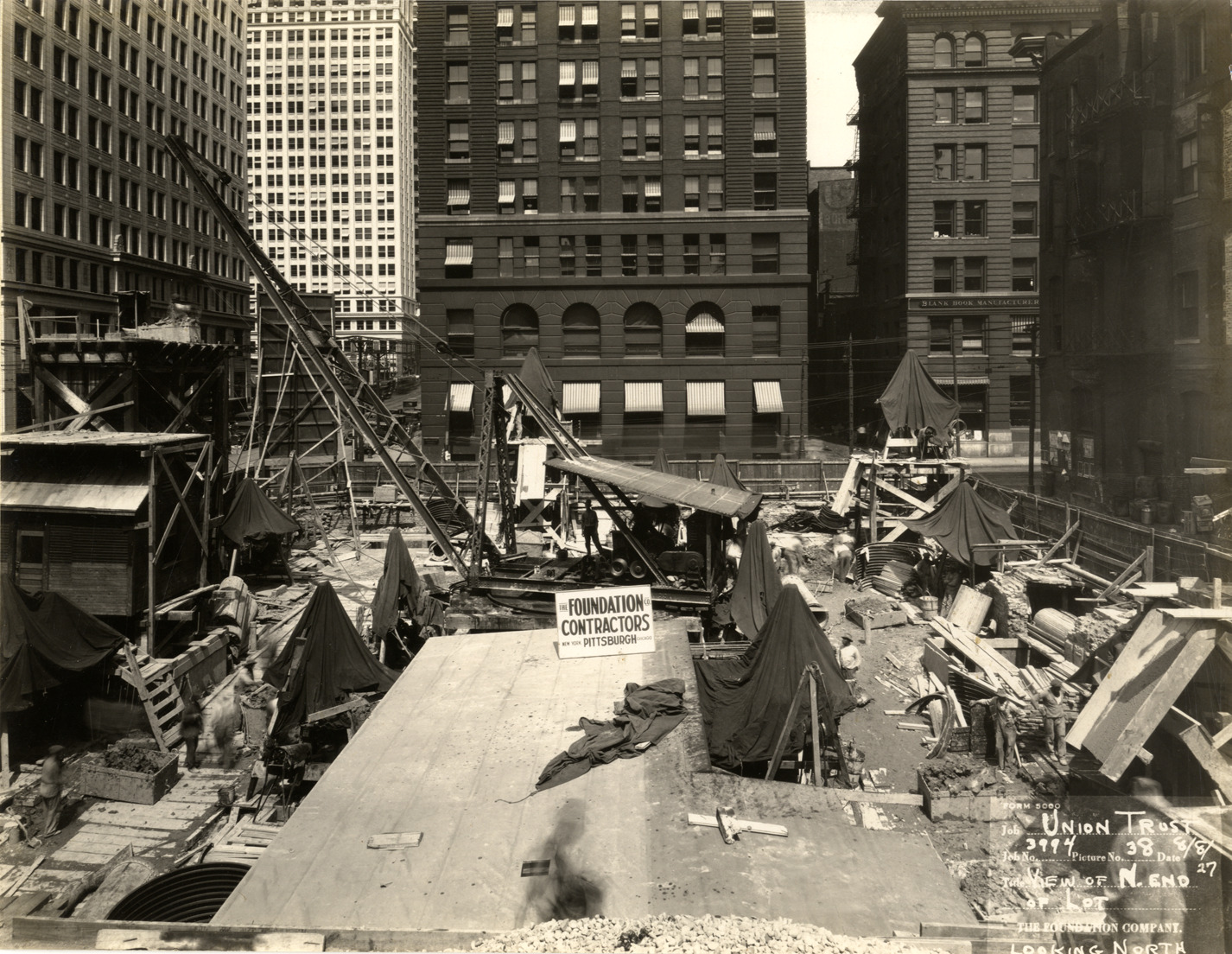 View of the construction of the foundation for the Union Guardian Building. Crane, construction materials and "The Foundation Co., contractors, New York, Pittsburgh, Chicago" sign on building site. Office and commercial buildings in background. The building was also known as the Guardian Building and the Union Trust Building. Printed on front: "Form 5000. Job: Union Trust. Job no. 3994. Picture no. 38. Date: 8-8-27. Title: View of n. end of lot looking north. The Foundation Company."