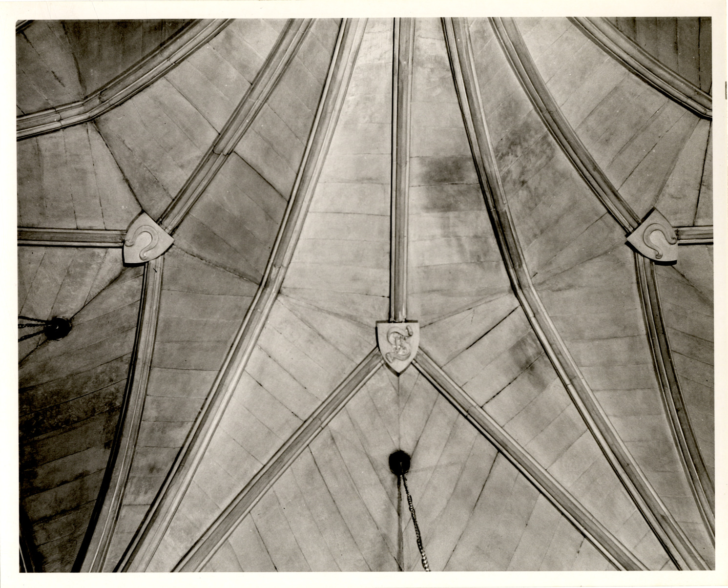 Close-up view of Gothic vaults in the Scripps Branch Library, Detroit Public Library, showing stylized initials of James E. Scripps. Handwritten on front: "Library." Handwritten on back: "Scripps Library, ribbed vaulting."