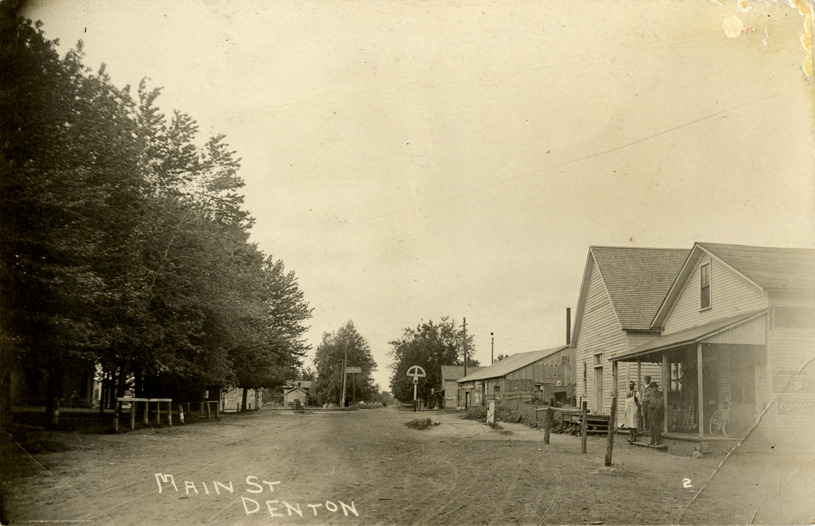 View of wooden-frame buildings on Main St. in Denton, Michigan. Printed on front: "Main St., Denton, Mich." Handwritten on back: "Hello cousin, How are you by this time we are all well and hope you are the same. Rich and Will are out hear [sic] your brothers. Hopping [sic] to hear from you again I am as ever, your cousin friend, John. Write soon." Card is postmarked March 1, 1912.